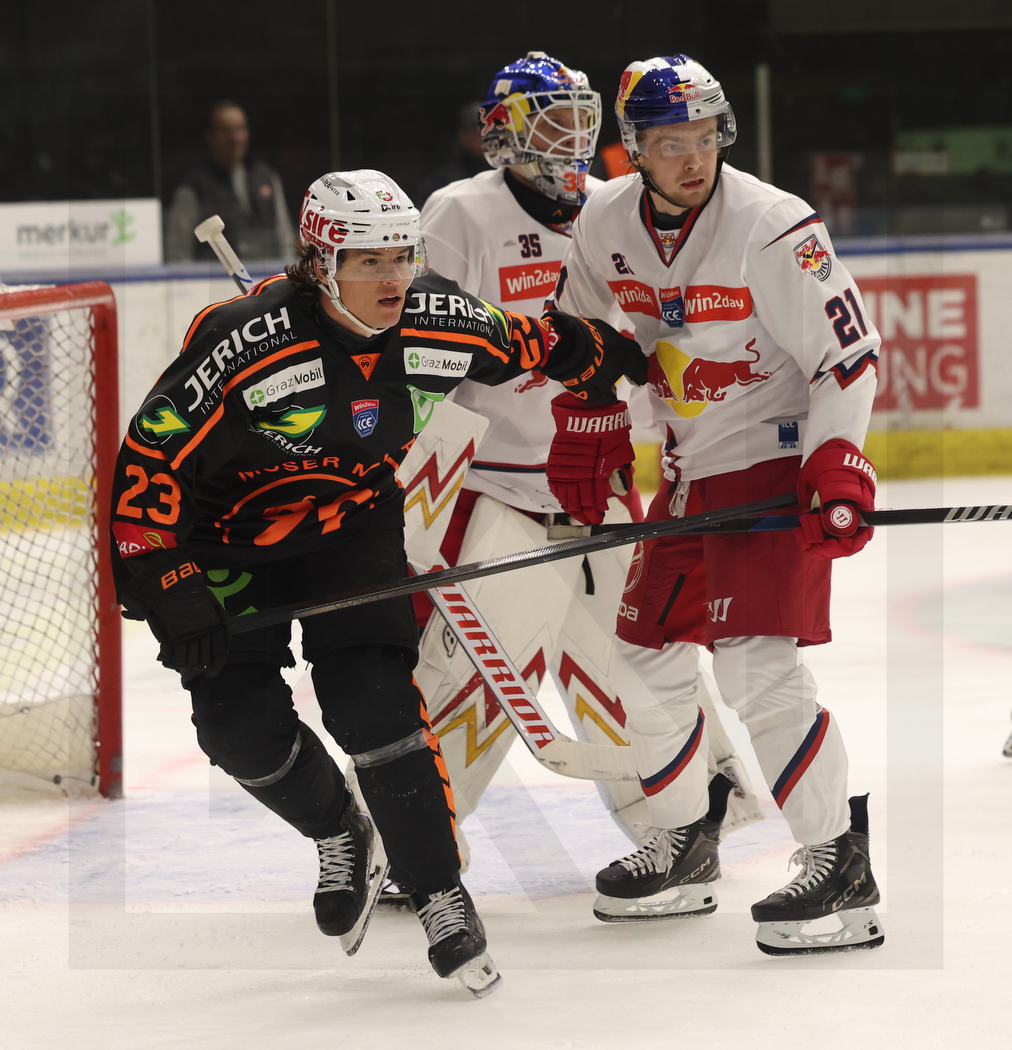 GRAZ, AUSTRIA, 14, Nov, 2025, Moser Medical Graz 99ers vs. EC Red Bull Salzburg. Image shows Kevin ROY #23 (Moser Medical Graz 99ers), Atte TOLVANEN #35 (EC Red Bull Salzburg) & Troy Wayne BOURKE #21 (EC Red Bull Salzburg). Photo: Werner Krainbucher