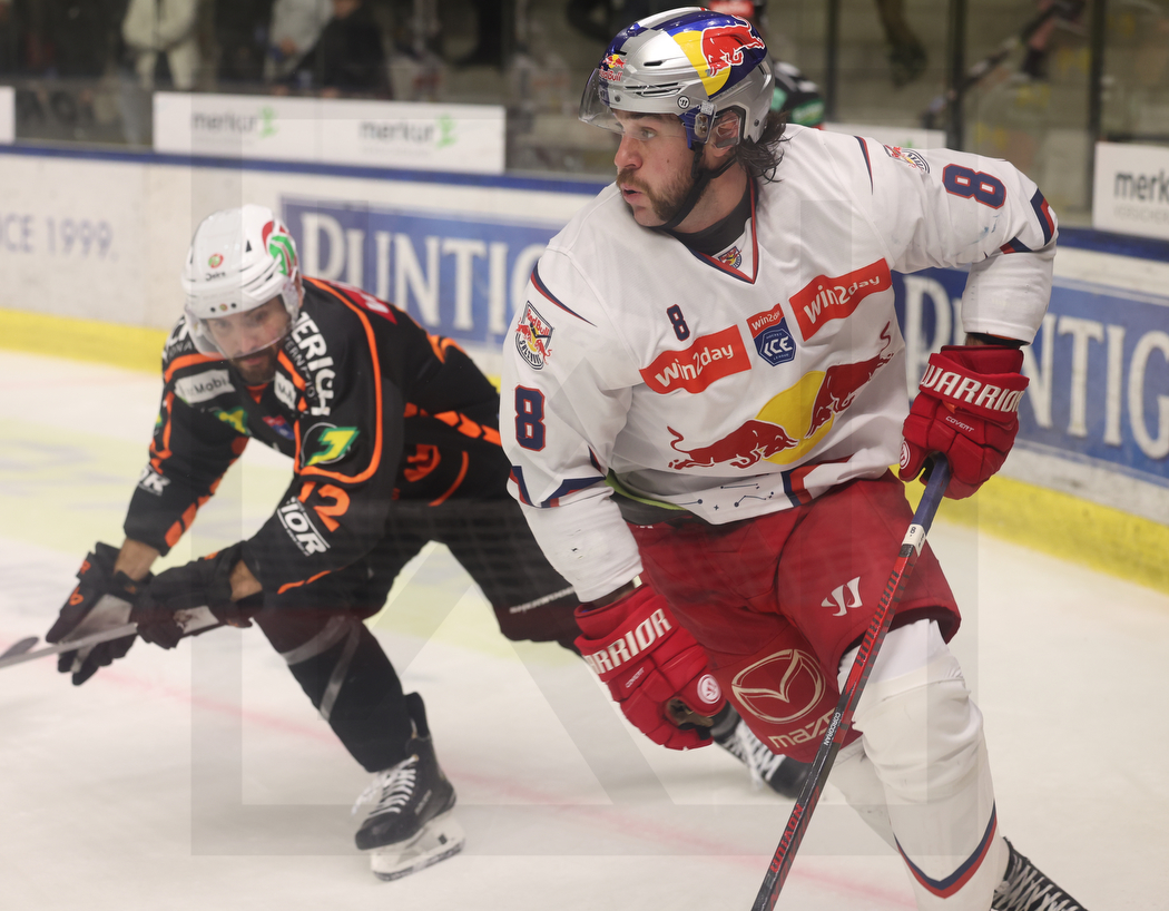 GRAZ, AUSTRIA, 14, Nov, 2025, Moser Medical Graz 99ers vs. EC Red Bull Salzburg. Image shows Marcus VELA #12 (Moser Medical Graz 99ers) & Connor CORCORAN #8 (EC Red Bull Salzburg). Photo: Werner Krainbucher