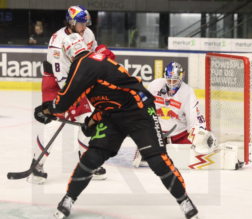 GRAZ, AUSTRIA, 14, Nov, 2025, Moser Medical Graz 99ers vs. EC Red Bull Salzburg. Image shows Connor CORCORAN #8 (EC Red Bull Salzburg), Marcus VELA #12 (Moser Medical Graz 99ers) & Atte TOLVANEN #35 (EC Red Bull Salzburg). Photo: Werner Krainbucher