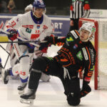 GRAZ, AUSTRIA, 16, Nov, 2025, Moser Medical Graz 99ers vs. HC TIWAG Innsbruck. Image shows Matthew VERNON #30 (HC TIWAG Innsbruck) & Josh CURRIE #64 (Moser Medical Graz 99ers). Photo: Werner Krainbucher