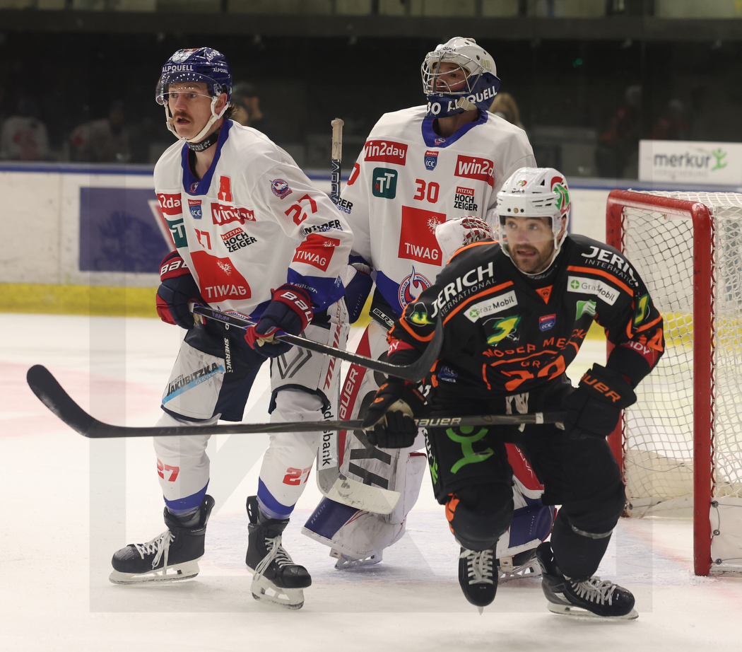 GRAZ, AUSTRIA, 16, Nov, 2025, Moser Medical Graz 99ers vs. HC TIWAG Innsbruck. Image shows Patrick KUDLA #27 (HC TIWAG Innsbruck), Matthew VERNON #30 (HC TIWAG Innsbruck) & Josh CURRIE #64 (Moser Medical Graz 99ers). Photo: Werner Krainbucher