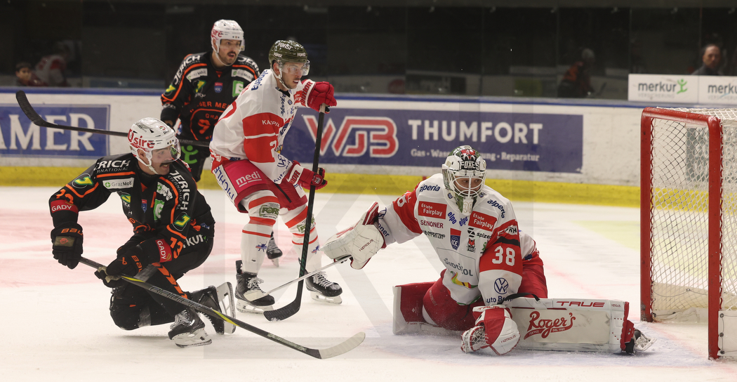 GRAZ, AUSTRIA, 23, Nov, 2025, Moser Medical Graz 99ers vs. HCB Südtirol Alperia. Image shows Michael SCHIECHL #13 (Moser Medical Graz 99ers), Marcus VELA #12 (Moser Medical Graz 99ers), Jason SEED #27 (HCB Südtirol Alperia) & Samuel HARVEY #38 (HCB Südtirol Alperia). Photo: Werner Krainbucher