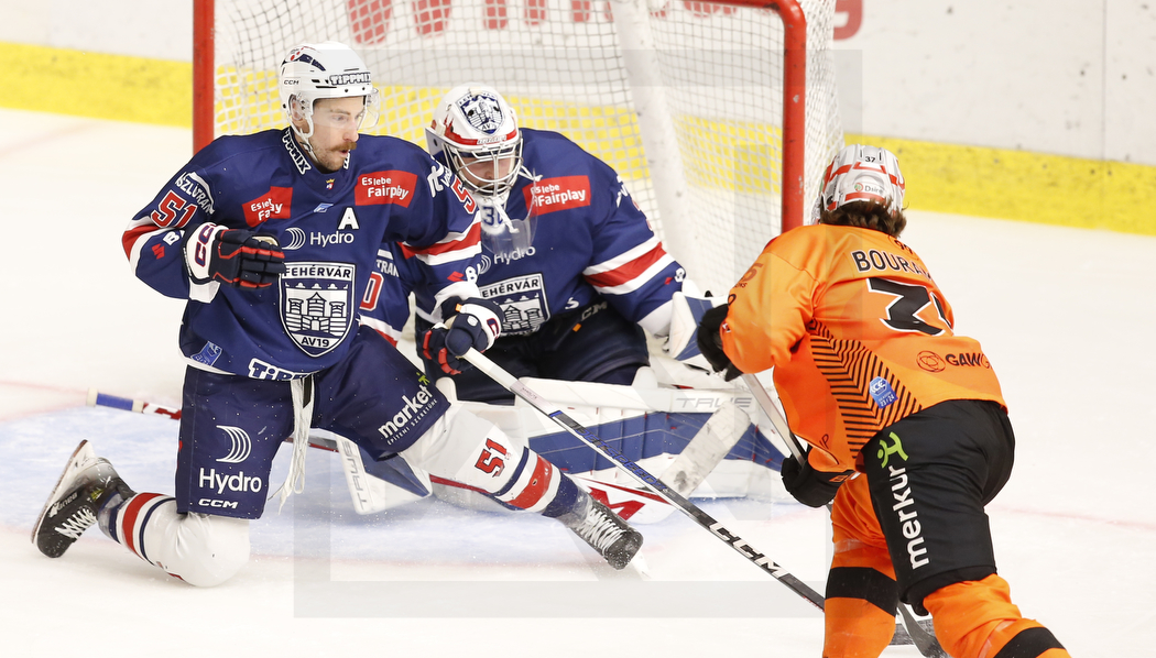 GRAZ, AUSTRIA, 24.Nov. 2023 – Moser Medical Graz 99ers vs. Hydro Fehervar AV 19. Image shows Timothy CAMPBELL #51 (Hydro Fehervar AV 19), Olivier ROY #30 (Hydro Fehervar AV 19) & Gustav BOURAMMAN #37 (Moser Medical Graz 99ers). Photo: Werner Krainbucher