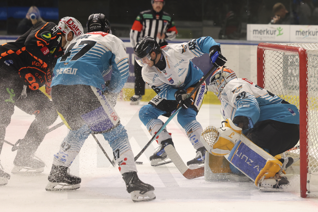GRAZ, AUSTRIA, 30, Nov, 2025, Moser Medical Graz 99ers vs. Steinbach Black Wings Linz. Image shows Paul HUBER #52 (Moser Medical Graz 99ers), Logan ROE #47 (Steinbach Black Wings Linz), Niklas Andre WÜRSCHL #46 (Steinbach Black Wings Linz) & Rasmus TIRRONEN #32 (Steinbach Black Wings Linz). Photo: Werner Krainbucher