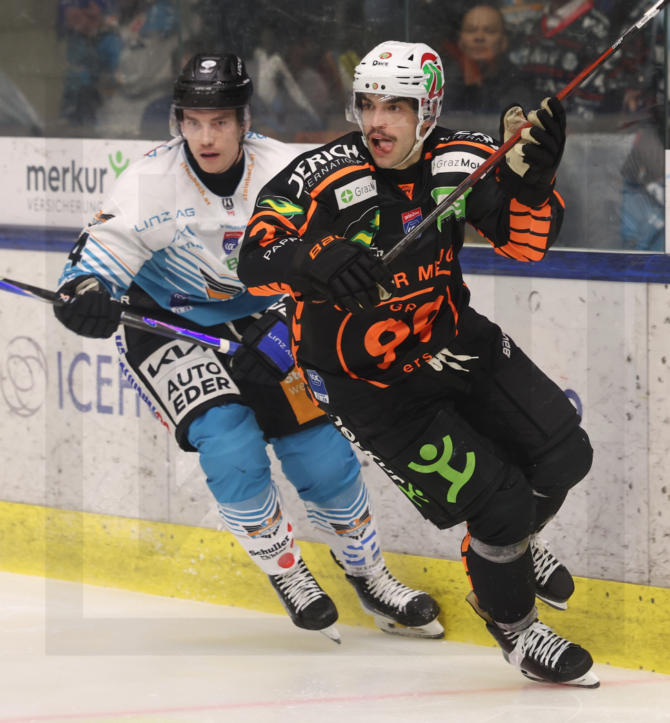 GRAZ, AUSTRIA, 30, Nov, 2025, Moser Medical Graz 99ers vs. Steinbach Black Wings Linz. Image shows Ryan MACKINNON #4 (Steinbach Black Wings Linz) & Lukas HAUDUM #21 (Moser Medical Graz 99ers). Photo: Werner Krainbucher