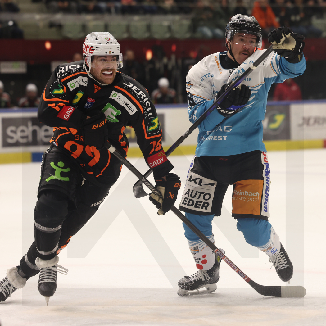 WK20251130_0460 30. November 2025 1050 × 1050 PHOTO GALLERY ICEHL ROUND 25 GRAZ 99ERS VS. BLACK WINGS LINZ 3:2 GRAZ, AUSTRIA, 30, Nov, 2025, Moser Medical Graz 99ers vs. Steinbach Black Wings Linz. Image shows Chris COLLINS #10 (Moser Medical Graz 99ers) & Ken OGRAJENSEK #18 (Steinbach Black Wings Linz). Photo: Werner Krainbucher