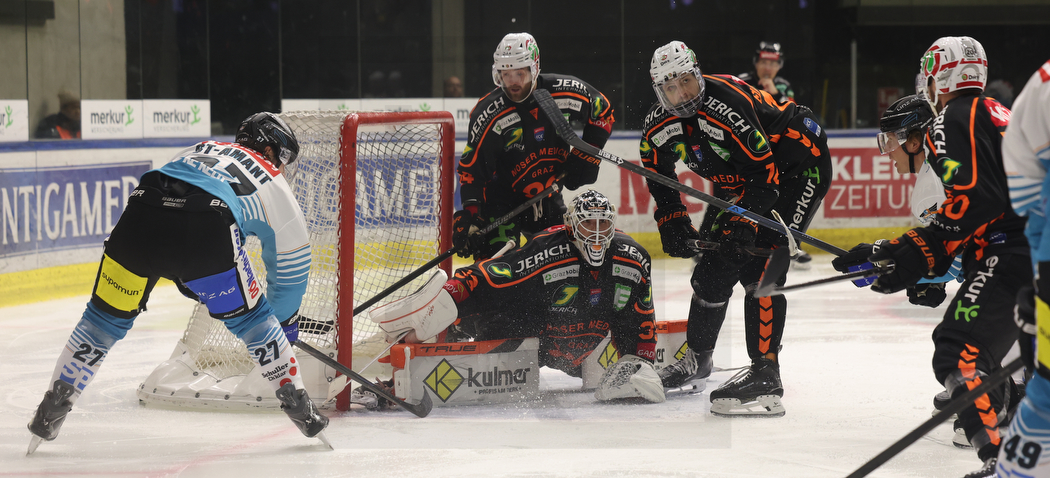 GRAZ, AUSTRIA, 30, Nov, 2025, Moser Medical Graz 99ers vs. Steinbach Black Wings Linz. Image shows Shawn ST-AMANT #27 (Steinbach Black Wings Linz), Kilian ZÜNDEL #14 (Moser Medical Graz 99ers), Maxime LEGACE #33 (Moser Medical Graz 99ers) & Paul STAPELFELDT #18 (Moser Medical Graz 99ers). Photo: Werner Krainbucher