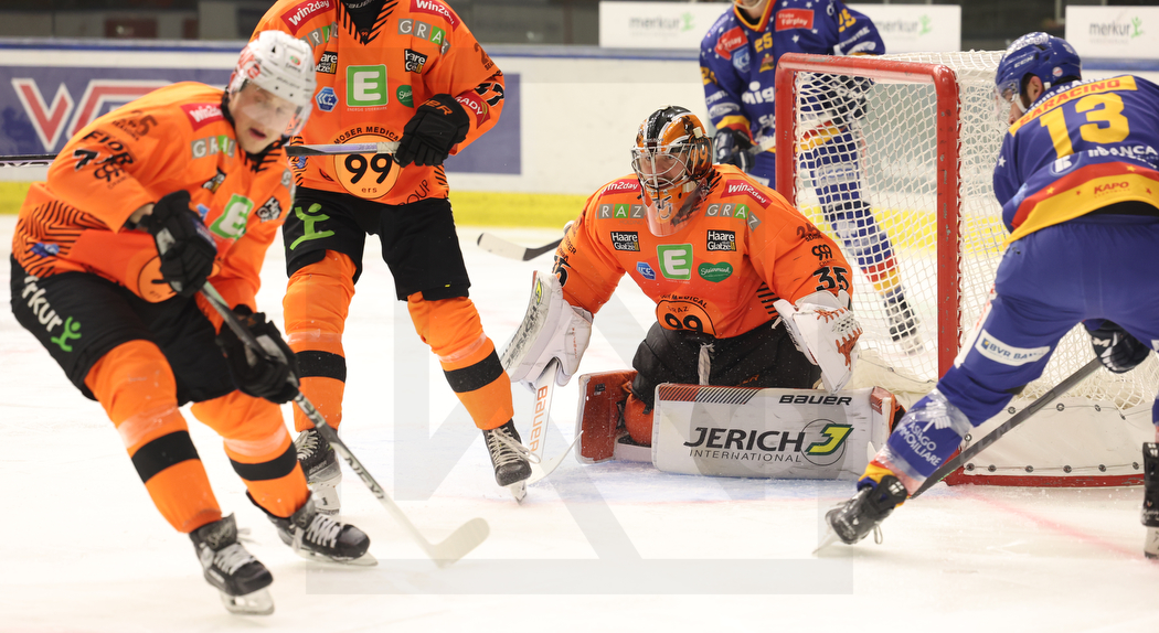 GRAZ, AUSTRIA, 28.Nov. 2023 – Moser Medical Graz 99ers vs. Migross Supermercati Asiago. Image shows Sam ANTONITSCH #76 (Moser Medical Graz 99ers), Lars VOLDEN #35 (Moser Medical Graz 99ers) & Nicholas Samuel SARACINO #13 (Migross Supermercati Asiago). Photo: Werner Krainbucher