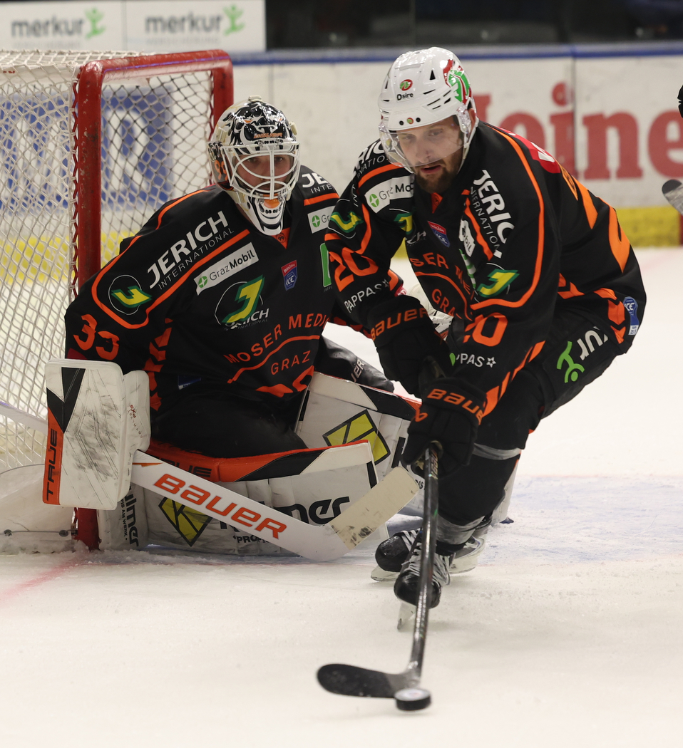 GRAZ, AUSTRIA, 17, Dec, 2025, Moser Medical Graz 99ers vs. Olimpija Ljubljana. Image shows Maxime LEGACE #33 (Moser Medical Graz 99ers) & Nico BRUNNER #20 (Moser Medical Graz 99ers). Photo: Werner Krainbucher