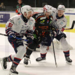 GRAZ, AUSTRIA, 19, Dec, 2025, Moser Medical Graz 99ers vs. Hydro Fehervar AV 19. Image shows Csanad ERDELY #36 (Hydro Fehervar AV 19), Nick BAILEN #7 (Moser Medical Graz 99ers) & Rasmus REIJOLA #45 (Hydro Fehervar AV 19). Photo: Werner Krainbucher