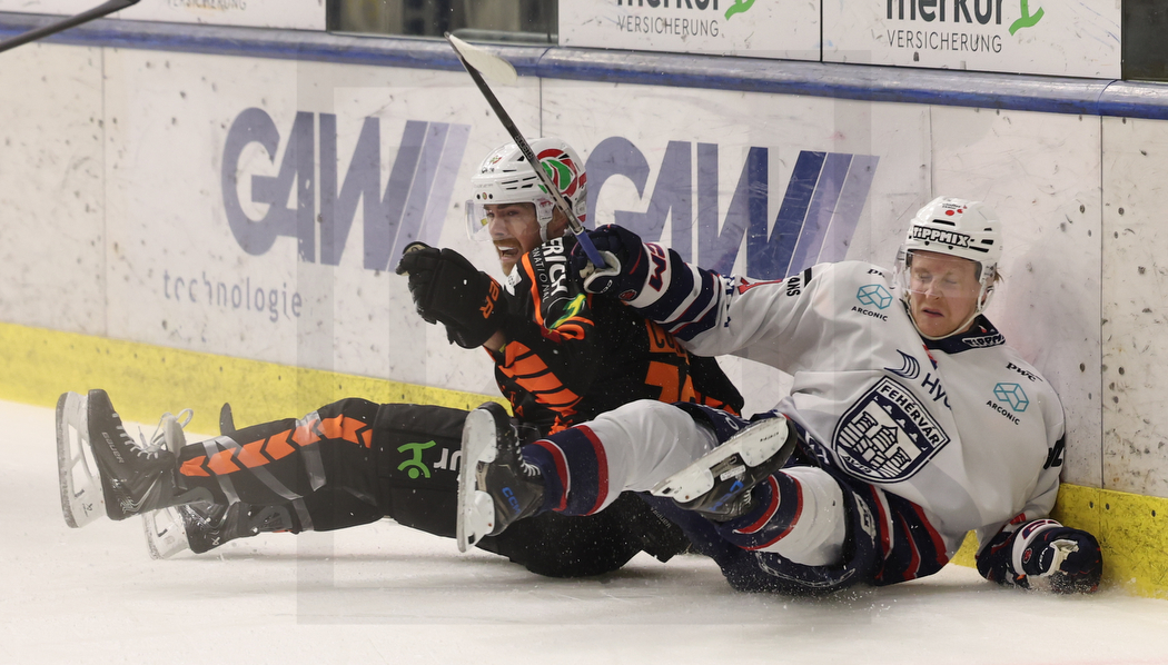 GRAZ, AUSTRIA, 19, Dec, 2025, Moser Medical Graz 99ers vs. Hydro Fehervar AV 19. Image shows Chris COLLINS #10 (Moser Medical Graz 99ers) & Ol Einar Engeland ANDERSEN #79 (Hydro Fehervar AV 19). Photo: Werner Krainbucher