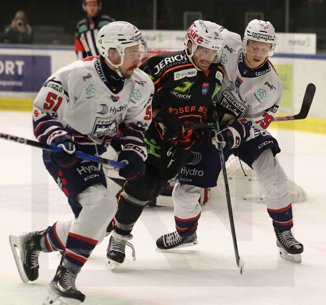 GRAZ, AUSTRIA, 19, Dec, 2025, Moser Medical Graz 99ers vs. Hydro Fehervar AV 19. Image shows Timothy CAMPBELL #51 (Hydro Fehervar AV 19), Chris COLLINS #10 (Moser Medical Graz 99ers) & Ol Einar Engeland ANDERSEN #79 (Hydro Fehervar AV 19). Photo: Werner Krainbucher