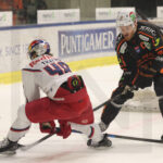 GRAZ, AUSTRIA, 23, Jan, 2026, Moser Medical Graz 99ers vs. EC Red Bull Salzburg. Image shows Thomas RAFFL #5 (EC Red Bull Salzburg) & Kasper Aleksanteri KOTKANSALO #5 (Moser Medical Graz 99ers). Photo: Werner Krainbucher