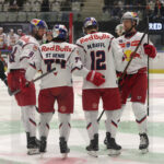 GRAZ, AUSTRIA, 23, Jan, 2026, Moser Medical Graz 99ers vs. EC Red Bull Salzburg. Image shows Atte TOLVANEN #35 (EC Red Bull Salzburg), Devante STEPHENS #23 (EC Red Bull Salzburg), Chris COLLINS #10 (Moser Medical Graz 99ers), Michael SCHIECHL #13 (Moser Medical Graz 99ers) & Connor CORCORAN #8 (EC Red Bull Salzburg). Photo: Werner Krainbucher