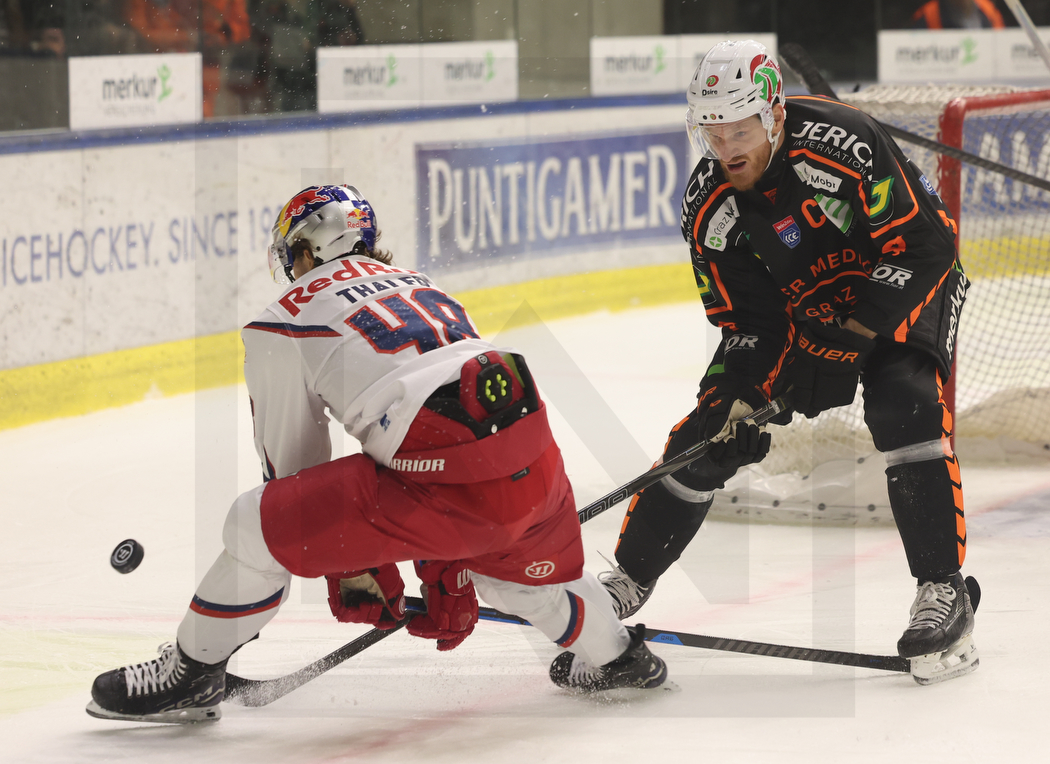 GRAZ, AUSTRIA, 23, Jan, 2026, Moser Medical Graz 99ers vs. EC Red Bull Salzburg. Image shows Lucas THALER #48 (EC Red Bull Salzburg) & Korbinian HOLZER #4 (Moser Medical Graz 99ers). Photo: Werner Krainbucher