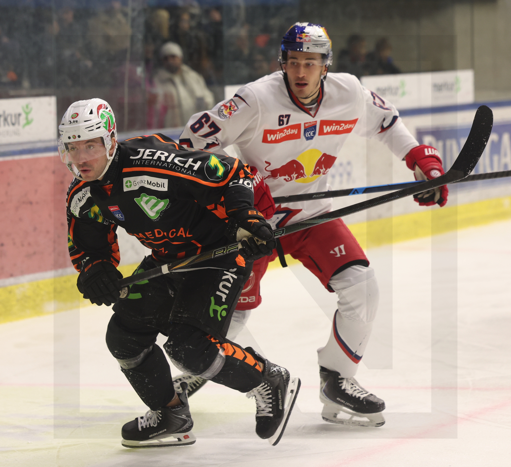 WK20260123_0360 23. Januar 2026 1050 × 960 PHOTO GALLERY ICEHL ROUND 42 GRAZ 99ERS – EC RED BULL SALZBURG 2:4 GRAZ, AUSTRIA, 23, Jan, 2026, Moser Medical Graz 99ers vs. EC Red Bull Salzburg. Image shows Lukas KAINZ #19 (Moser Medical Graz 99ers) & Philipp WIMMER #67 (EC Red Bull Salzburg). Photo: Werner Krainbucher