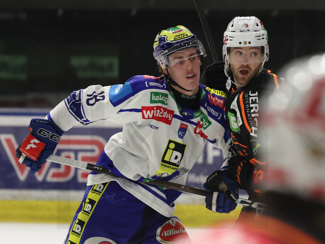 GRAZ, AUSTRIA, 27, Feb, 2026, Moser Medical Graz 99ers vs. EC iDM Wärmepumpen VSV. Image shows Nico Massimo USCHAN #18 (EC iDM Wärmepumpen VSV) & Josh CURRIE #64 (Moser Medical Graz 99ers). Photo: Werner Krainbucher