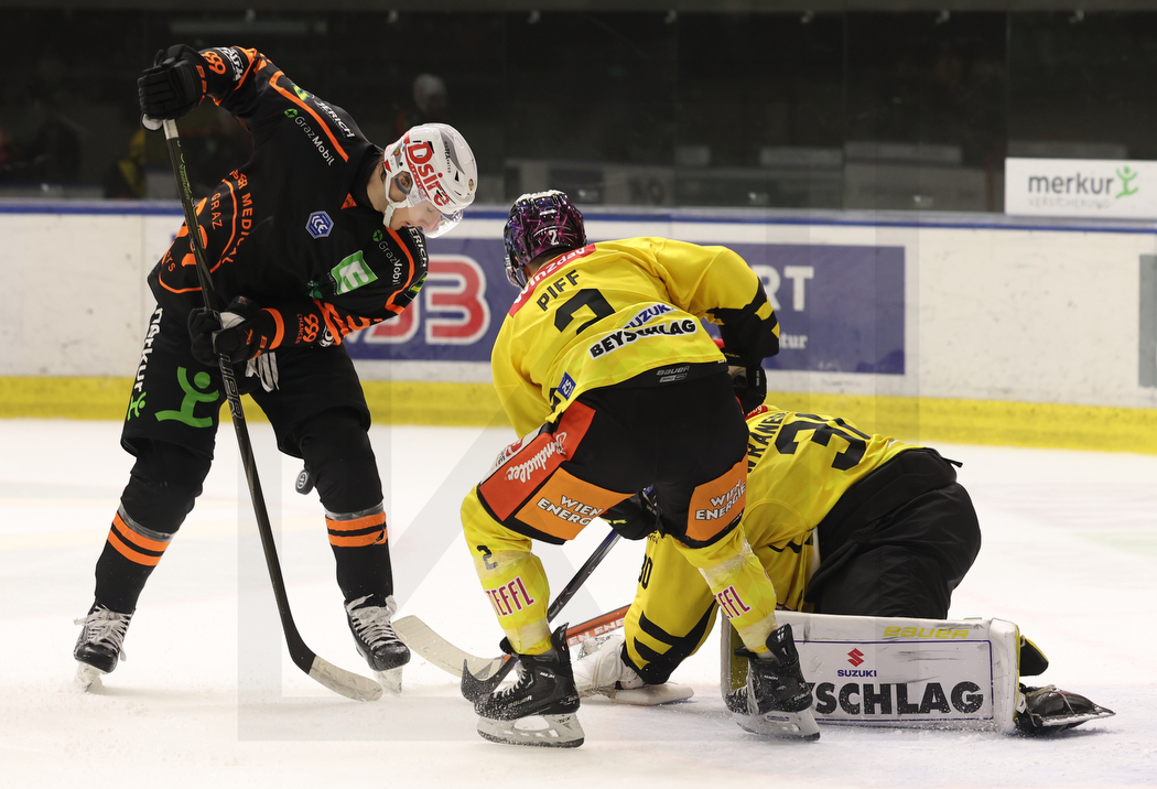 GRAZ, AUSTRIA, 06.Oct. 2024 – Moser Medical Graz 99ers vs. spusu Vienna Capitals. Image shows Paul HUBER #52 (Moser Medical Graz 99ers), Lukas PIFF (spusu Vienna Capitals) & Sebastian WRANESCHITZ #30 (spusu Vienna Capitals). Photo: Werner Krainbucher