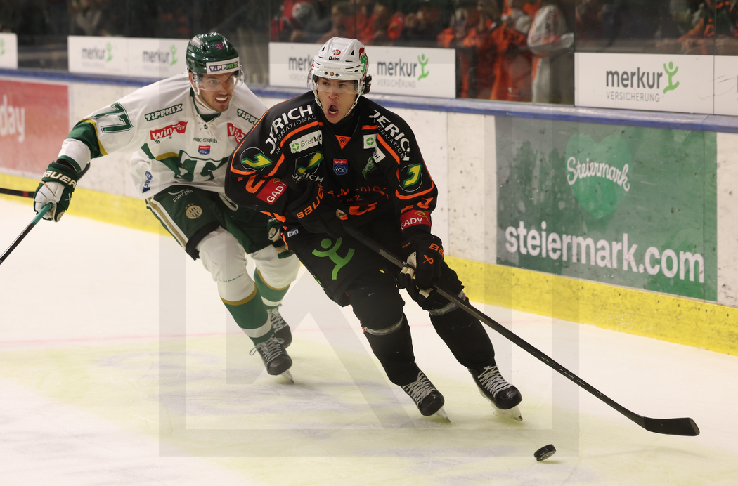 WK20251010_0753 10. Oktober 2025 1050 × 692 PHOTO GALLERY ICEHL ROUND 9 MOSER MEDICAL GRAZ 99ERS – FTC-TELEKOM 2:3 OT GRAZ, AUSTRIA, 10, Oct, 2025, Moser Medical Graz 99ers vs. FTC-Telekom. Image shows Gergely TOTH #77 (FTC-Telekom) & Kevin ROY #23 (Moser Medical Graz 99ers). Photo: Werner Krainbucher