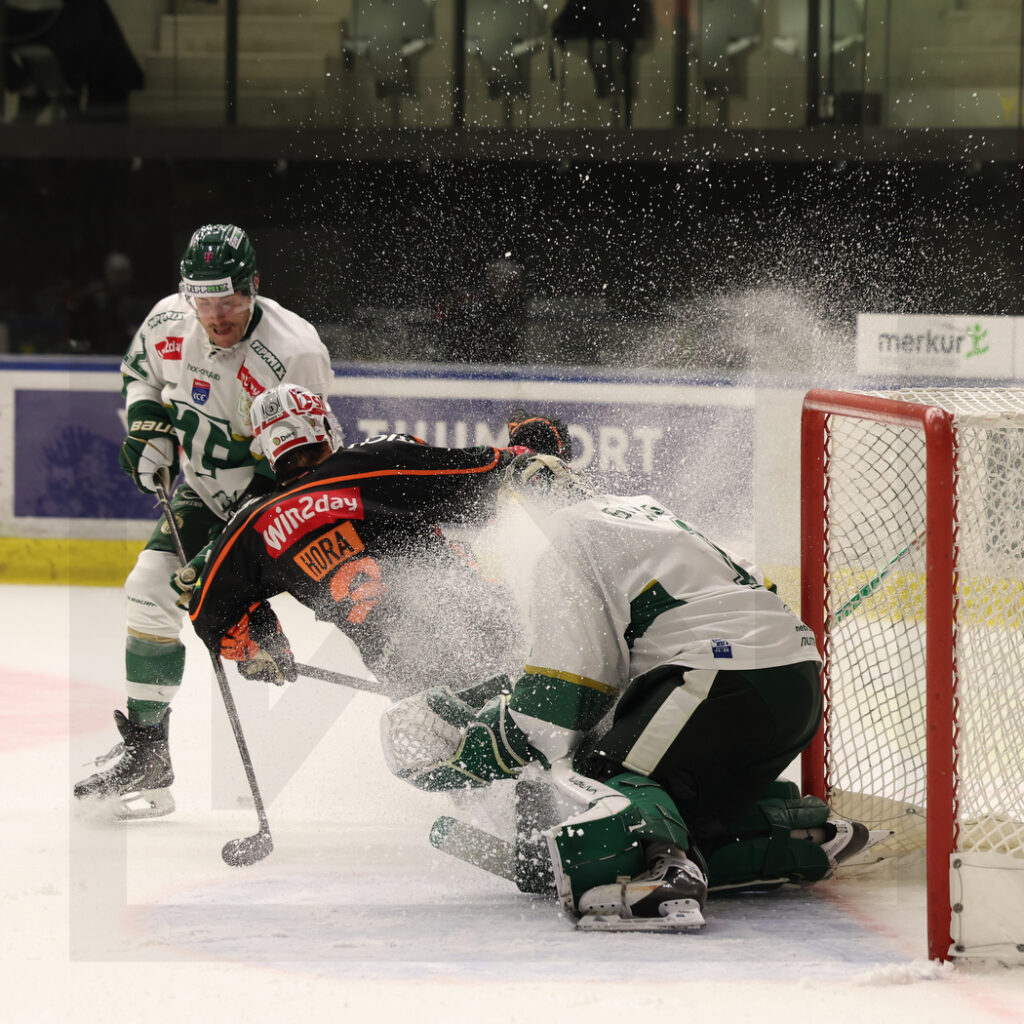 GRAZ, AUSTRIA, 10, Oct, 2025, Moser Medical Graz 99ers vs. FTC-Telekom. Image shows Braeden SHAW #12 (FTC-Telekom), Frank HORA #3 (Moser Medical Graz 99ers) & Bence BALIZS #1 (FTC-Telekom). Photo: Werner Krainbucher