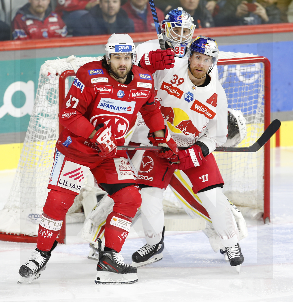 KLAGENFURT, AUSTRIA, 26.Mar. 2023 – EC KAC vs. EC Red Bull Salzburg. Image shows Marcel WITTING #47 (EC KAC), Atte TOLVANEN #35 (EC Red Bull Salzburg) & Chay GENOWAY #39 (EC Red Bull Salzburg). Photo: Werner Krainbucher