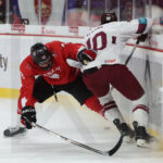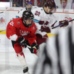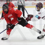 TRENCIN, SLOVAKIA, 23, Apr, 2026, U18 Men’s Worlds, CAN vs. LAT. Image shows Herberts LAUGALIS #20 (Latvia) & Jean-Cristoph LEMIEUX #22 (Canada). Photo: Werner Krainbucher