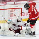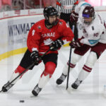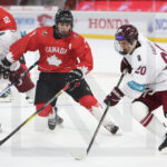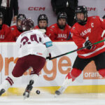 TRENCIN, SLOVAKIA, 23, Apr, 2026, U18 Men’s Worlds, CAN vs. LAT. Image shows Markuss SAVIELS #27 (Latvia) & Alexis JOSEPH #13 (Canada). Photo: Werner Krainbucher