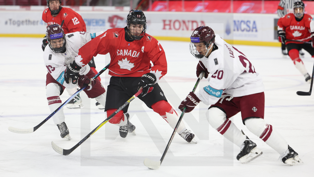 TRENCIN, SLOVAKIA, 23, Apr, 2026, U18 Men’s Worlds, CAN vs. LAT. Image shows Davids DANILOVS #13 (Latvia), Alessandro DI IORIO #17 (Canada) & Herberts LAUGALIS #20 (Latvia). Photo: Werner Krainbucher