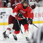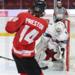 TRENCIN, SLOVAKIA, 23, Apr, 2026, U18 Men’s Worlds, CAN vs. LAT. Image shows Mathis PRESTON #14 (Canada) & Ilja NIKITINS #29 (Latvia). Photo: Werner Krainbucher