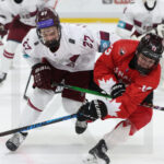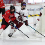 TRENCIN, SLOVAKIA, 23, Apr, 2026, U18 Men’s Worlds, CAN vs. LAT. Image shows Ryder CALI #12 (Canada) & Adrians KLAVINS #10 (Latvia). Photo: Werner Krainbucher