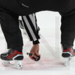 TRENCIN, SLOVAKIA, 23, Apr, 2026, U18 Men’s Worlds, CAN vs. LAT. Image shows linesman catching the puck. Photo: Werner Krainbucher