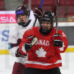 TRENCIN, SLOVAKIA, 23, Apr, 2026, U18 Men’s Worlds, CAN vs. LAT. Image shows Thomas ROUSSEAU #10 (Canada) & Martins KLAUCANS #8 (Latvia). Photo: Werner Krainbucher