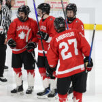 TRENCIN, SLOVAKIA, 23, Apr, 2026, U18 Men’s Worlds, CAN vs. LAT. Image shows goal celebration Team Canada. Photo: Werner Krainbucher