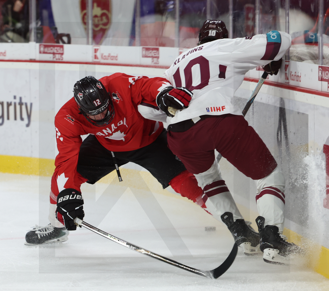 TRENCIN, SLOVAKIA, 23, Apr, 2026, U18 Men’s Worlds, CAN vs. LAT. Image shows Ryder CALI #12 (Canada) & Adrians KLAVINS #10 (Latvia). Photo: Werner Krainbucher