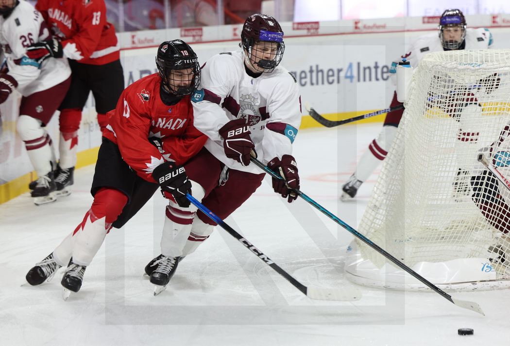 TRENCIN, SLOVAKIA, 23, Apr, 2026, U18 Men’s Worlds, CAN vs. LAT. Image shows Thomas ROUSSEAU #10 (Canada) & Martins KLAUCANS #8 (Latvia). Photo: Werner Krainbucher