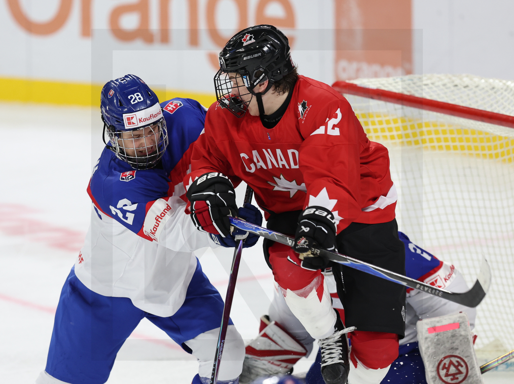 TRENCIN, SLOVAKIA, 22, Apr, 2026, U18 Men’s Worlds, CAN vs. SVK. Image shows Sebastian BRATH #28 (Slovakia) & Jean-Cristoph LEMIEUX #22 (Canada). Photo: Werner Krainbucher
