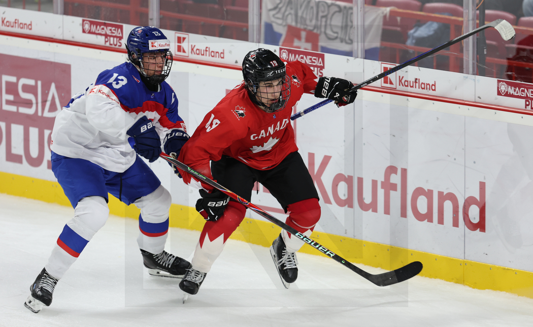 TRENCIN, SLOVAKIA, 22, Apr, 2026, U18 Men’s Worlds, CAN vs. SVK. Image shows Filip KOVALCIK #13 (Slovakia) & Adam VALENTINI #19 (Canada). Photo: Werner Krainbucher