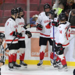 TRENCIN, SLOVAKIA, 27, Apr, 2026, U18 Men’s Worlds, FIN vs. CAN. Image shows goal celebration Team Canada. Photo: Werner Krainbucher