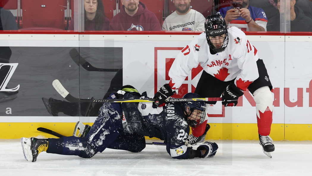 TRENCIN, SLOVAKIA, 27, Apr, 2026, U18 Men’s Worlds, FIN vs. CAN. Image shows Ryder CALI #12 (Canada) & Juho PIIPARINEN #6 (Finland). Photo: Werner Krainbucher