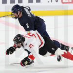 TRENCIN, SLOVAKIA, 27, Apr, 2026, U18 Men’s Worlds, FIN vs. CAN. Image shows Zach OLSEN #9 (Canada) & Juho PIIPARINEN #6 (Finland). Photo: Werner Krainbucher
