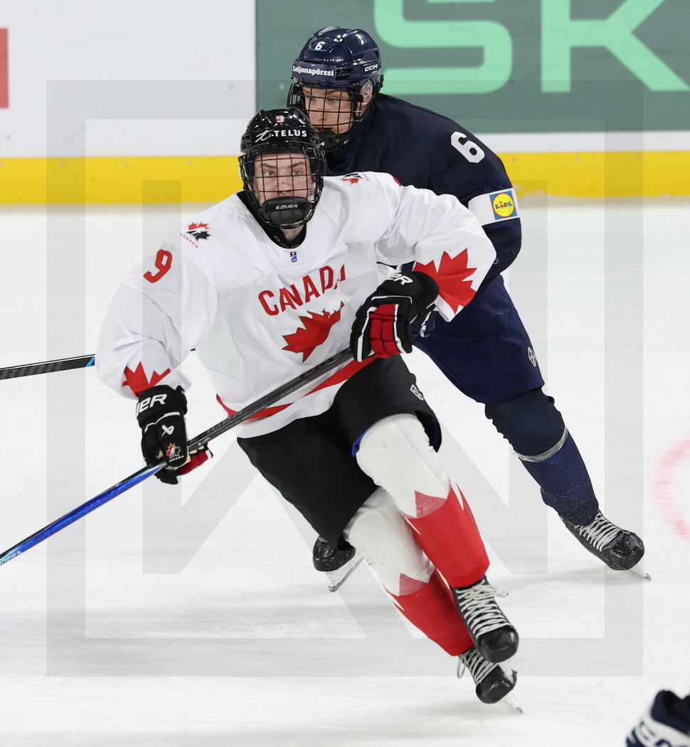 TRENCIN, SLOVAKIA, 27, Apr, 2026, U18 Men’s Worlds, FIN vs. CAN. Image shows Zach OLSEN #9 (Canada) & Juho PIIPARINEN #6 (Finland). Photo: Werner Krainbucher