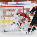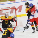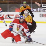 BRATISLAVA, SLOVAKIA, 25, Apr, 2026, U18 Men’s Worlds, GER vs. CZE. Image shows David HUK #22 (Czech Republic) & Max BOLLE #1 (Germany). Photo: Werner Krainbucher