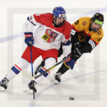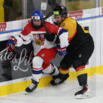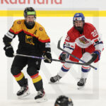 BRATISLAVA, SLOVAKIA, 25, Apr, 2026, U18 Men’s Worlds, GER vs. CZE. Image shows Adrian KAHUN #13 (Germany) & Adam KLAUS #23 (Czech Republic). Photo: Werner Krainbucher