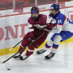 TRENCIN, SLOVAKIA, 27, Apr, 2026, U18 Men’s Worlds, LAT vs. SVK. Image shows Tomass ERDMANIS-HERMANIS #6 (Latvia) & Tomas SELIC #24 (Slovakia). Photo: Werner Krainbucher