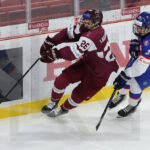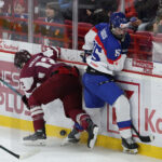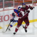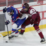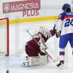 TRENCIN, SLOVAKIA, 27, Apr, 2026, U18 Men’s Worlds, LAT vs. SVK. Image shows Karlis TAMENIEKS #7 (Latvia) & Timothy KAZDA #19 (Slovakia). Photo: Werner Krainbucher