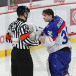 TRENCIN, SLOVAKIA, 27, Apr, 2026, U18 Men’s Worlds, LAT vs. SVK. Image shows referee and Samuel HRENAK #30 (Slovakia) after getting a shot to his head. Photo: Werner Krainbucher