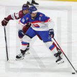 TRENCIN, SLOVAKIA, 27, Apr, 2026, U18 Men’s Worlds, LAT vs. SVK. Image shows Samuel SRAMATY #25 (Slovakia) & Ricards LISOVSKIS #3 (Latvia). Photo: Werner Krainbucher