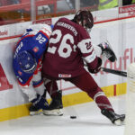 TRENCIN, SLOVAKIA, 27, Apr, 2026, U18 Men’s Worlds, LAT vs. SVK. Image shows Edvards LAGANOVSKIS #26 (Latvia) & Samuel HYBSKY #26 (Slovakia). Photo: Werner Krainbucher