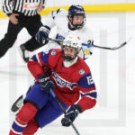 TRENCIN, SLOVAKIA, 22, Apr, 2026, U18 Men’s Worlds, NOR vs. FIN. Image shows Rasmus MIILUNPOHJA #22 (Finland) & Philip TOLLEFSEN #8 (Norway). Photo: Werner Krainbucher