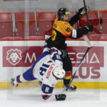 TRENCIN, SLOVAKIA, 29, Apr, 2026, U18 Men’s Worlds, GER vs. NOR. Image shows Felix TIMRAZ-WESTIN #30 (Norway) & Leon LELL #11 (Germany). Photo: Werner Krainbucher